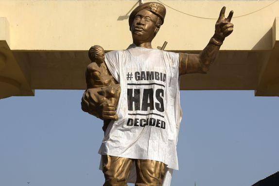 A Banjul, une statue commémorant le coup d’Etat du 22 juillet 1994, par lequel Yahya Jammeh était arrivé au pouvoir, est recouverte d’un T-shirt sur lequel est inscrit « La Gambie a décidé ». Crédits : SEYLLOU/AFP