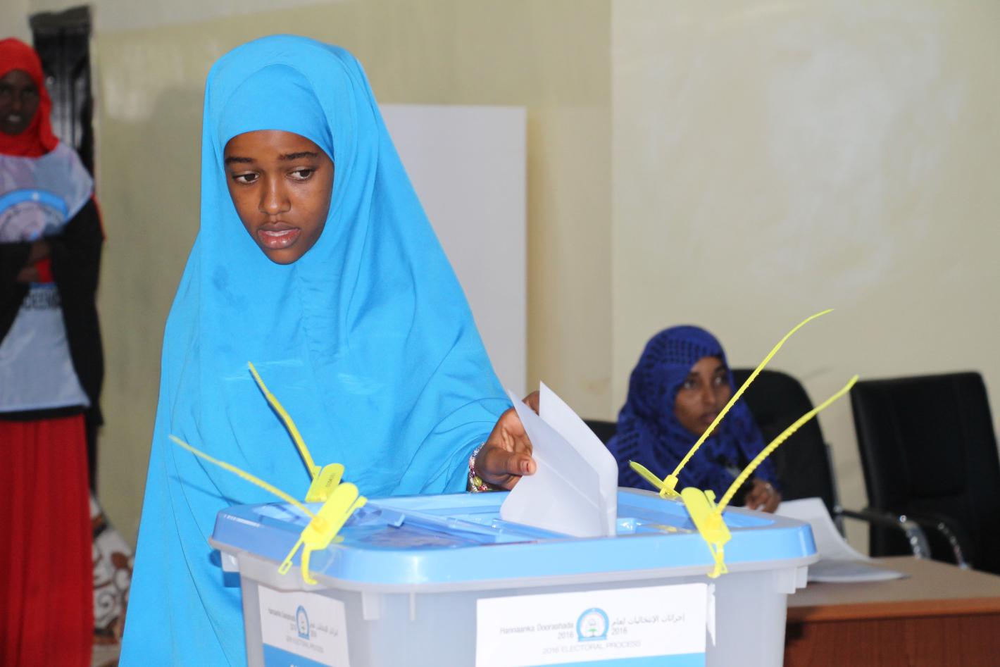 A delegate casts her vote during the electoral process to choose members of the House of the people in Baidoa, Somalia on 1 December 2016. UN Photo