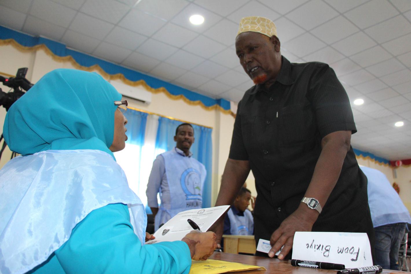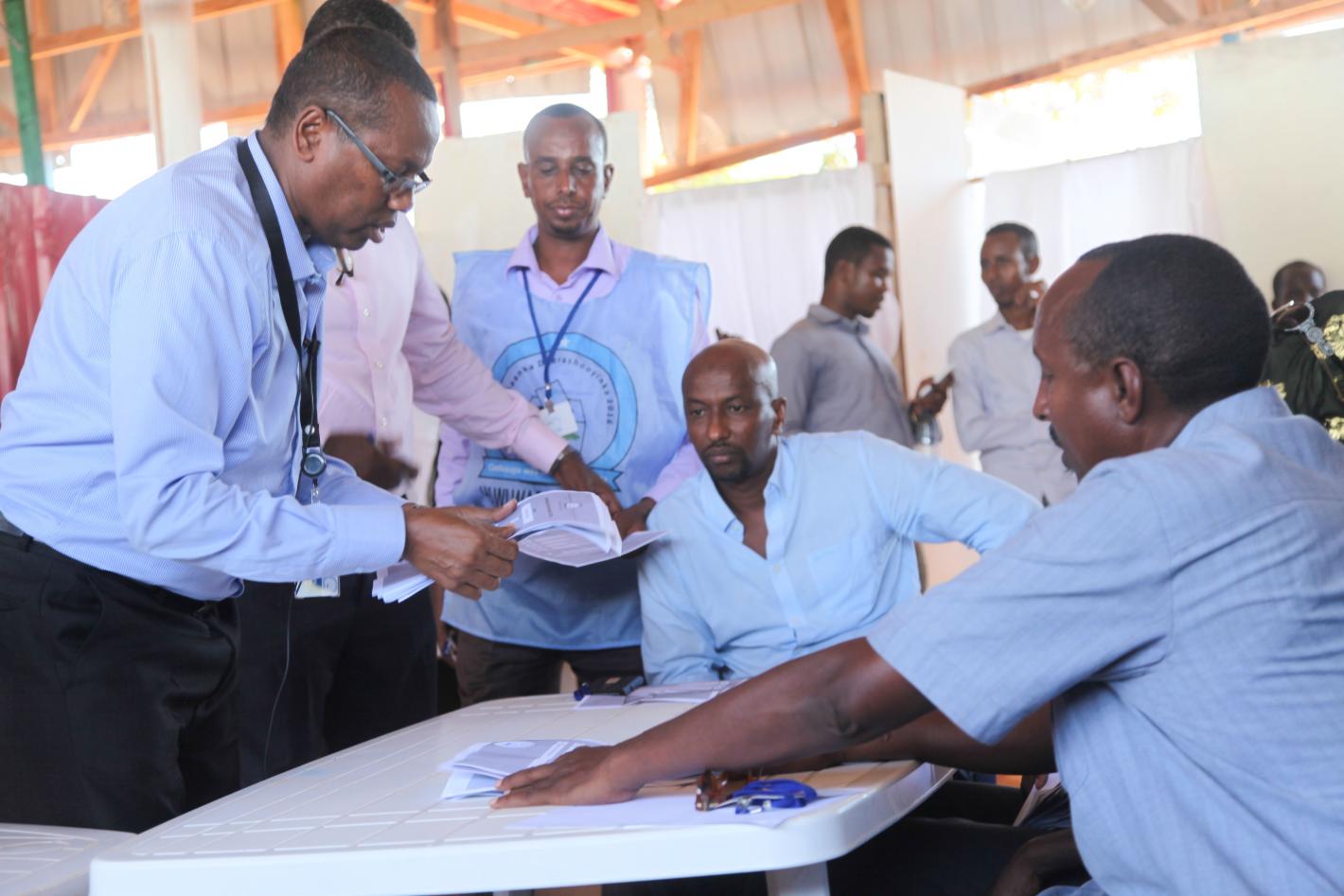 An electoral official speaks to a delegate during the electoral process to choose members of the Lower House of the Somali Parliament in Baidoa, Somalia on 16 November 2016. UN Photo