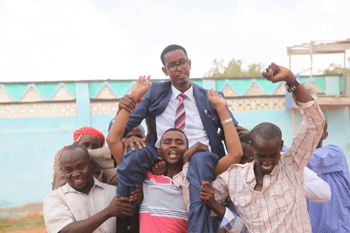 An MP-elect is carried shoulder-high by jubilant supporters to celebrate his victory in the ongoing electoral process to choose members of the Lower House of the Federal Parliament in Kismaayo, Somalia on 13 November 2016. UN Photo