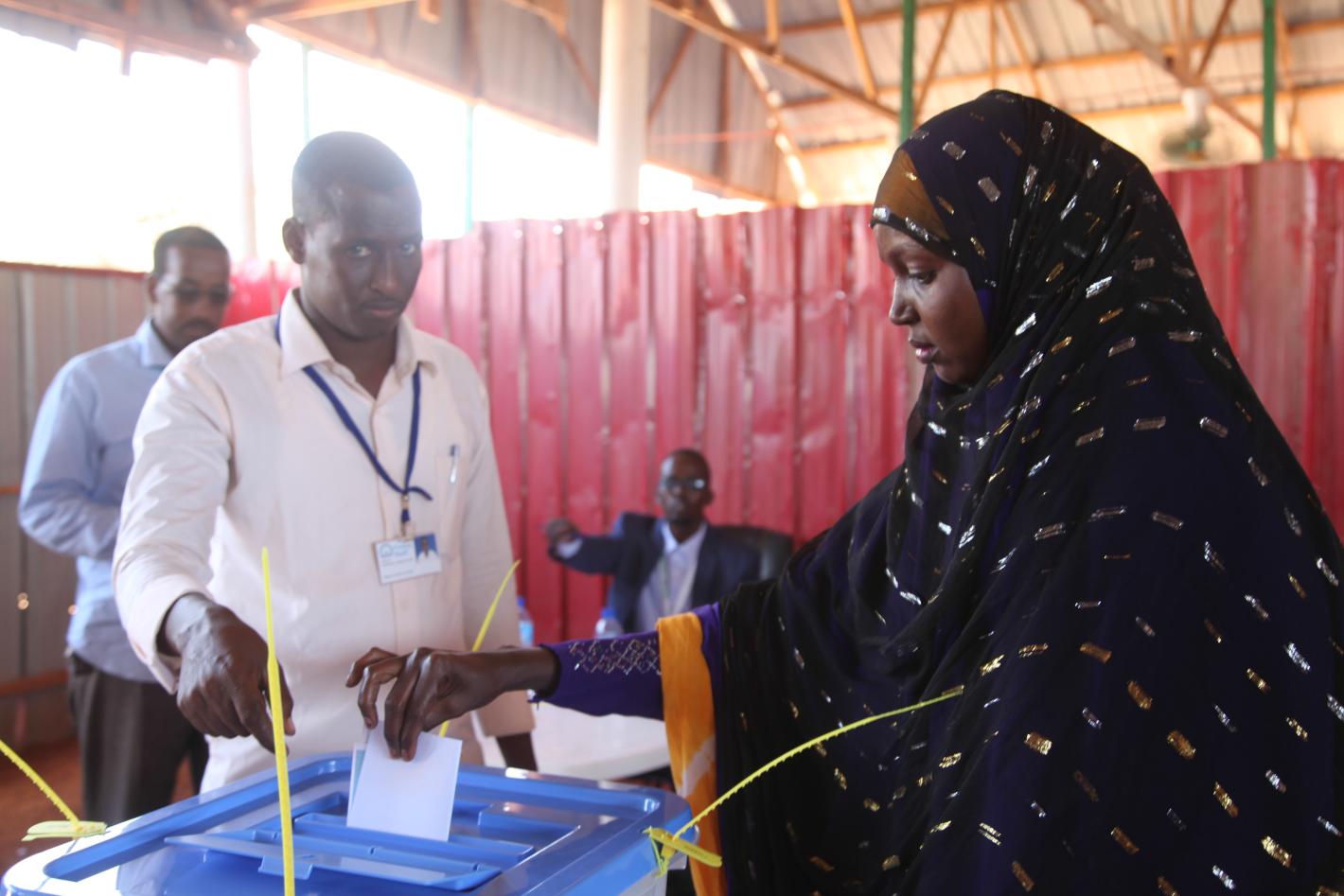 A delegate casts her vote during the electoral process to choose members of the Lower House of the Somali Parliament in Kismaayo, Somalia on November 9, 2016. AMISOM Photo / Awil Abukar