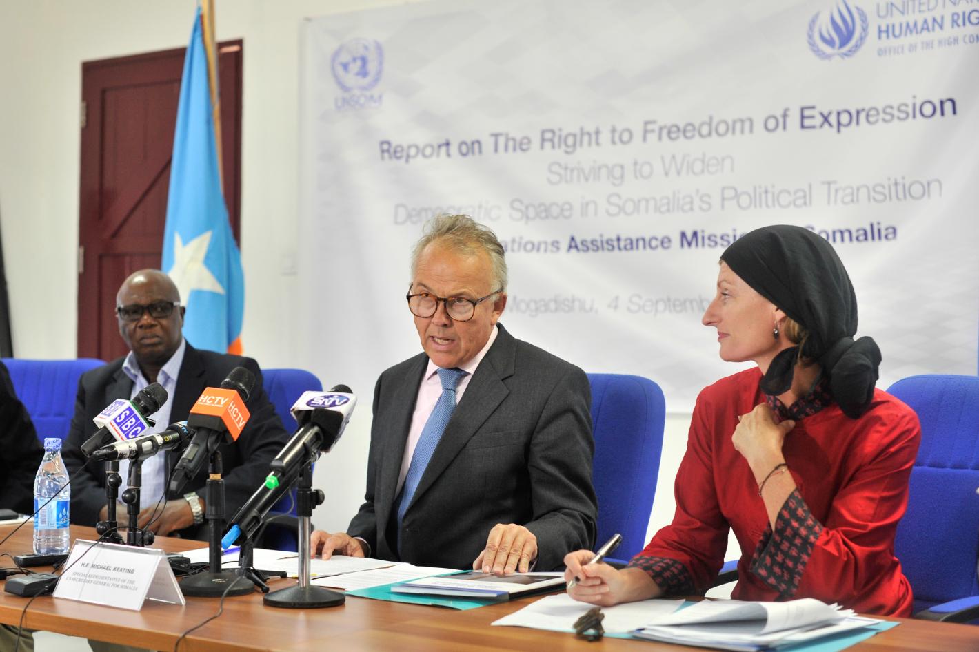 The Special Representative of the UN Secretary-General for Somalia (SRSG), Michael Keating (middle), addresses journalists during the release of a UN report on the right to freedom of expression in Mogadishu, Somalia on 4 September 2016. Left is the Deputy SRSG Raisedon Zenenga and right is Kirsten Young, the United Nations Assistance Mission in Somalia (UNSOM) Chief of Human Rights. UN Photo