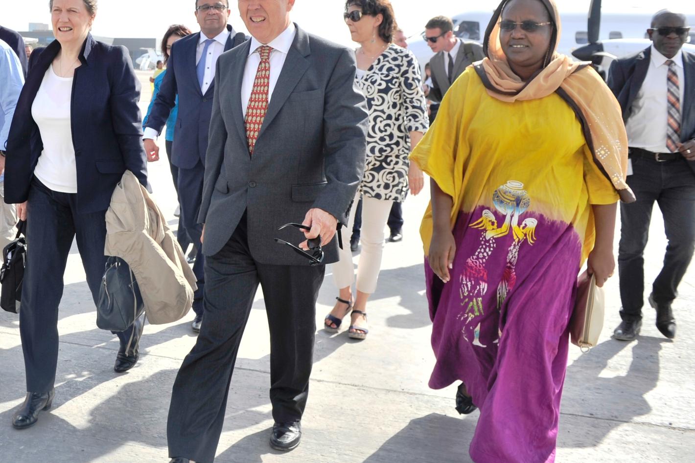 The Special Representative of the UN Secretary-General for Somalia (SRSG), Michael Keating, receives the Administrator of the United Nations Development Programme, Helen Clark, upon her arrival at Aden Abdulle Airport in Mogadishu on 24 August 2016. UN Photo