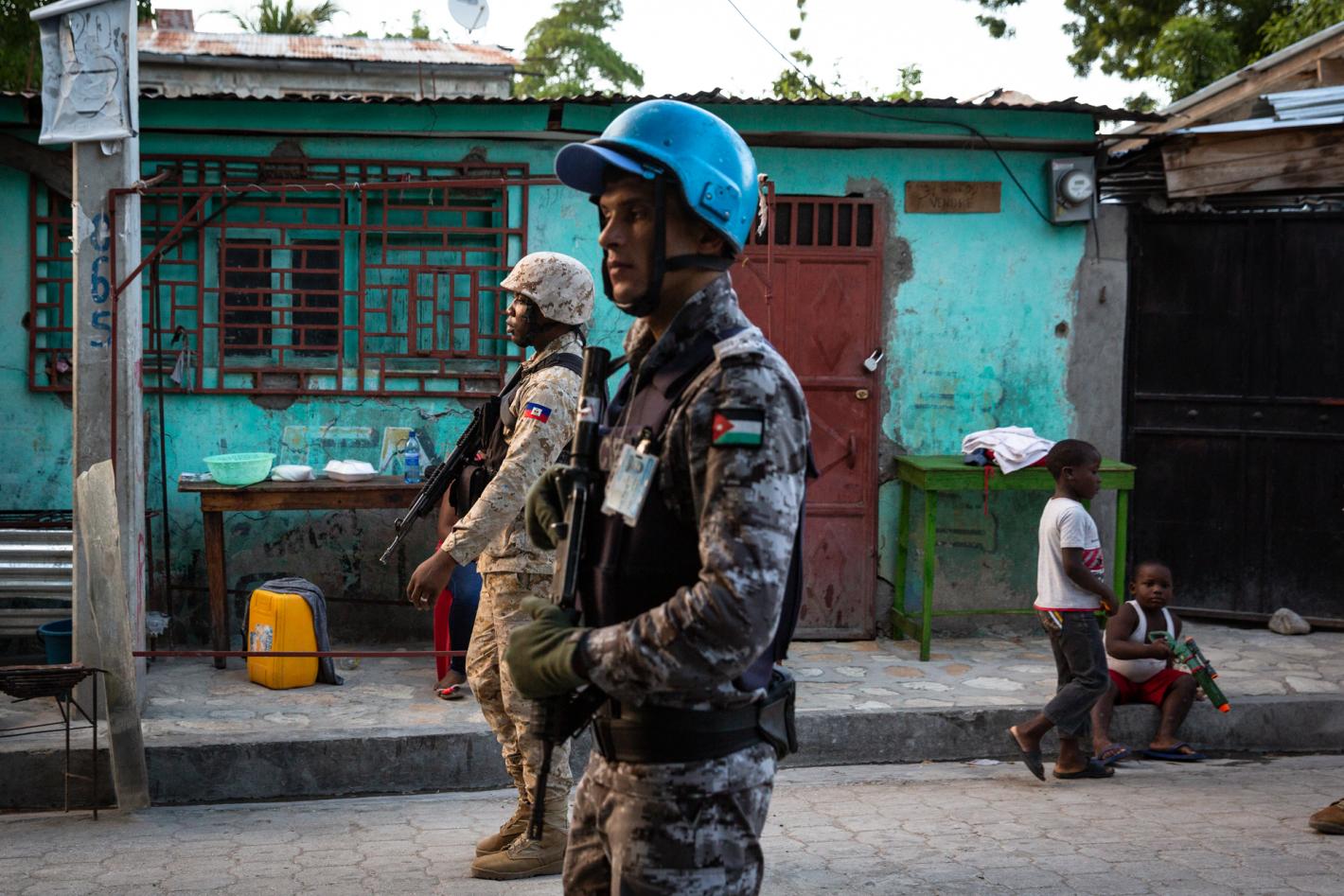 Joint patrol of the Haitian National Police (HNP), individual police officers ( IPOs) and Jordanian police officers of the Formed Police Unit (FPU) of Gonaïves (Artibonite). © Leonora Baumann / UN / MINUJUSTH, 2018