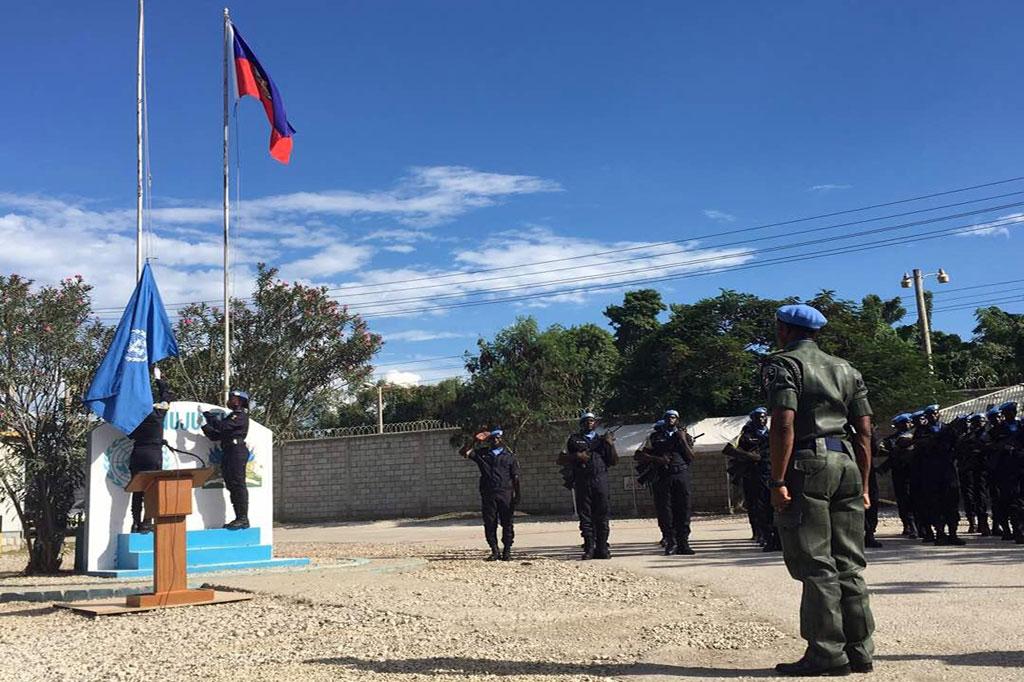 The UN flag is raised at the opening ceremony for the new United Nations Mission for Justice Support in Haiti (MINUJUSTH). Photo: Logan Abassi/MINUJUSTH