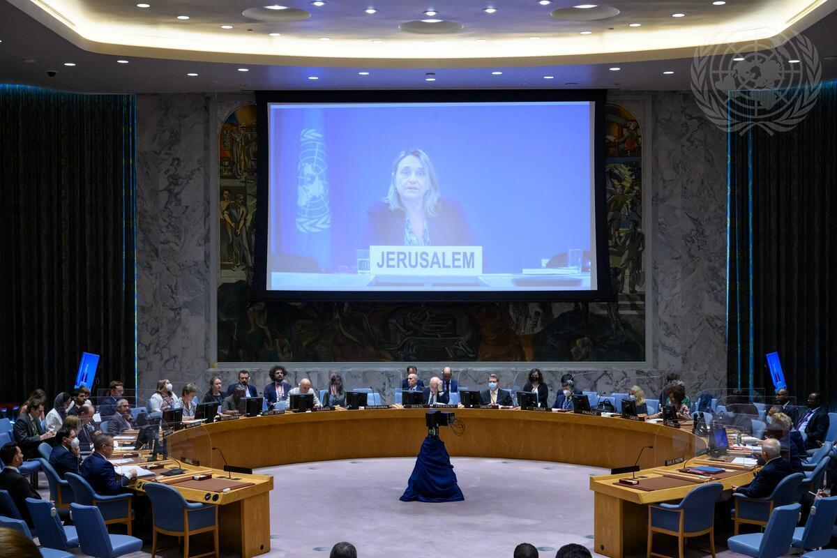 Lynn Hastings (on screen), Deputy Special Coordinator for the Middle East Peace Process, United Nations Resident Coordinator and Humanitarian Coordinator for the Occupied Palestinian Territory, briefs the Security Council meeting on the situation in the Middle East, including the Palestinian question. (UN Photo/Loey Felipe - 26 July 2022)